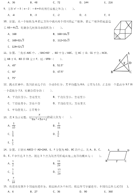 一、问题求解:第1——15小题,每小题3分,共45分。下列每题给出的A、B、C、D、E五个选项中,只有一项是符合试题要求的。