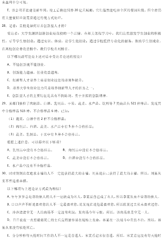 三、逻辑推理:第26——55小题,每小题2分,共60分。下列每题给出的A、B、C、D、E五个选项中,只有一项是最符合题目要求的。